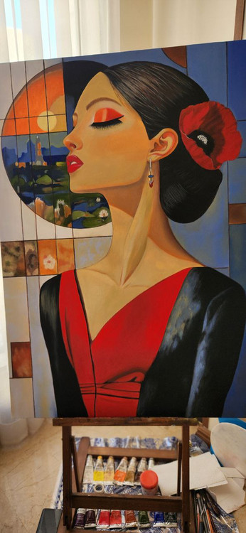 این تابلو یک پرترهی زنانه با رویکردی مدرن و هندسی است که با استفاده از رنگهای گرم و هماهنگ، حس آرامش، وقار و قدرت درونی را به تصویر میکشد. چشمان بستهی سوژه نمادی از تمرکز بر جهان درون و فاصله گرفتن از هیاهوی بیرونی است. ترکیب فرمهای شکسته و نرم، هویت زنانه را در لایههای رنگ و نور بازتعریف میکند.