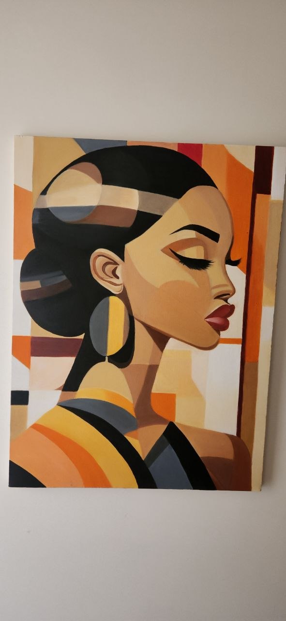 این تابلو رنگ روغن دستساز با طراحی مدرن و الهامبخش از زیبایی زنانه، فضای خانه یا محل کار شما را به یک گالری هنری تبدیل میکند. استفاده از رنگهای گرم مانند نارنجی، زرد و قهوهای در کنار خطوط هندسی و سایهروشنهای دقیق، جلوهای مدرن و چشمگیر ایجاد کرده است.